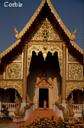 On Tuesday, July 29, we took a tuk tuk tour of Chang Mai temples, only a few, to notice the difference if any, between Thai temples and Burmese temples even though they are both for Therouada Buddhism. My impression is that the Burmese temples emphasize stupa shaped pagodas, and Thai temples include some stupas but emphasize buildings with special rooflines and more dragons. I have not yet learned the significance of the dragon, but the Thai temples and the Burmese temples both have pairs of lions in front of them, and we were told the story of the significance of the lions.