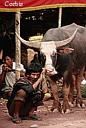 In Pantepao we went to the huge weekly market, which includes a livestock market. The biggest water buffaloes we've seen, by far, were walked in from villages two or three days away to see what they would bring on the market. We were told the black ones were thought to be the strongest, but the black and white mixed colored would probably bring the best price - their coloring making them more special, and the albinos - a few were present - would bring not very much. Size was some consideration, but color seemed much more important. Pigs, too, were for sale, but a sad sight to see. Their front legs were tied together and their back, then the four were drawn together and tied. Cords went from the feet across the poor animal's backs, and were tied to a carrying handle. Smaller pigs were tied two together into one carrying handle. They were laid out on their sides on concrete slabs, thankfully shaded, for prospective buyers to view, soiling themselves and each other by lying there all day. I have no idea how pigs are bought, sold, or treated at home, but these poor animals seemed to be suffering. The chickens weren't much better off, maybe worse. Four or five of them had their feet all tied together and they were lying on the ground in squaking, writhing groups.